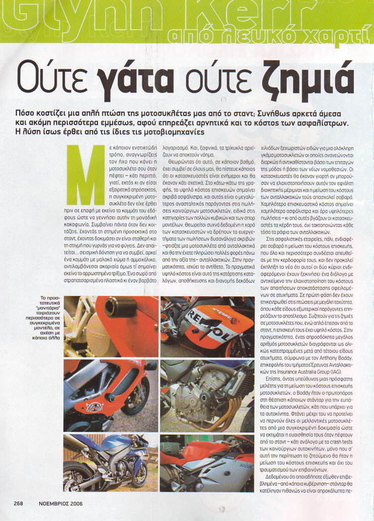 Εγω ευχομαι οι ασφαλιστηκες που αναφερει καθως και οι κατασκευαστριες εταιρειες να ασχοληθουν πραγματικα με το θεμα μιωσεις των σημιων σε περιπτωση πτωσης της μοτοσυκλετας προς οφελος μας και οχι μονο και μονο προς οφελος της τσεπης του και το θεμα μηνει εκει.