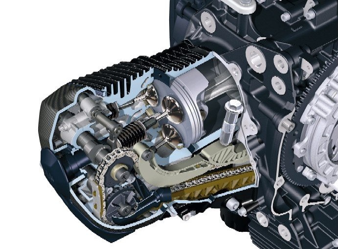 Boxer νέας γενιάς Ο boxer κινητήρας του HP2 Sport συνεχίζει να είναι αερόψυκτος, αλλά έχει δεχτεί σειρά βελτιώσεων που συντελούν στην αύξηση της απόδοσής του. Καταρχήν, κάθε κεφαλή απέκτησε πλέον δύο εκκεντροφόρους με αποτέλεσμα να μεταφερθεί ο κόφτης στις 9.500 σ.α.λ. Οι τέσσερις ακτινικά τοποθετημένες βαλβίδες συντελούν στη δημιουργία ενός πιο συμπαγούς θαλάμου καύσης και με αυτό τον τρόπο δεν υπάρχει ανάγκη για χρησιμοποίηση δεύτερου μπουζί, όπως στα μοντέλα R. Επίσης η διάμετρος των βαλβίδων αυξήθηκε, με αυτές τις εισαγωγής να φτάνουν τα 39 mm από 36 που ήταν πριν και αυτές της εξαγωγής να φτάνουν τα 33 mm από 31. Πρέπει να αναφέρουμε ότι πλέον κάθε εκκεντροφόρος ανοιγοκλείνει μία βαλβίδα εισαγωγής και μία εξαγωγής, με ανεξάρτητα κοκοράκια. Τα καπάκια των κεφαλών είναι κατασκευασμένα από ανθρακονήματα.