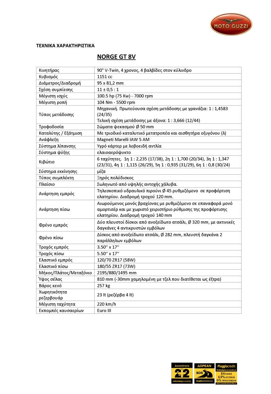Το Norge είναι ένας ακούραστος ταξιδιώτης, ένας αναγνωρισμένος πρωταθλητής για την αξιοπιστία του, εξελέγη tourer μοτοσυκλέτα της χρονιάς το 2006 και το 2007, πιστός σύντροφος της αστυνομίας σε πόλεις όπως το Μιλάνο και το Βερολίνο. Τώρα αυτή η πλήρως ανανεωμένη έκδοση GT 8V, παγιώνει τη αποστολή του, δηλαδή τον τουρισμό μεγάλων αποστάσεων.