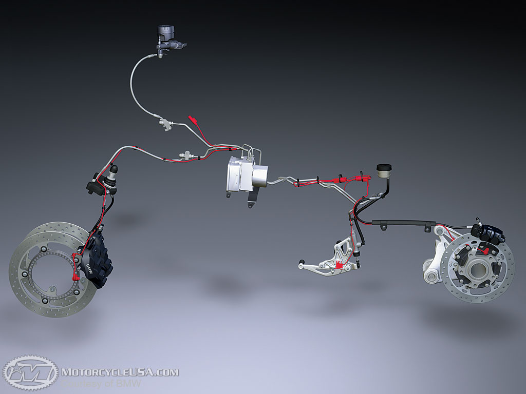 Οι τροχοί των μοτοσικλετών που φέρουν ABS διαθέτουν από έναν μεταλλικό δακτύλιο με εγκοπές ή τρύπες, τοποθετημένο σε κάθε τροχό με έδραση είτε στους δίσκους, ή στο κέντρο της ζάντας. Απέναντι από κάθε δακτύλιο υπάρχει ένας αισθητήρας, ο οποίος διαβάζει την περιστροφή του. Οι αισθητήρες και των 2 τροχών είναι συνδεδεμένοι με την κεντρική ηλεκτρουδραυλική μονάδα του συστήματος ABS, η οποία με την σειρά της είναι συνδεδεμένη με το κύκλωμα πίεσης των φρένων.